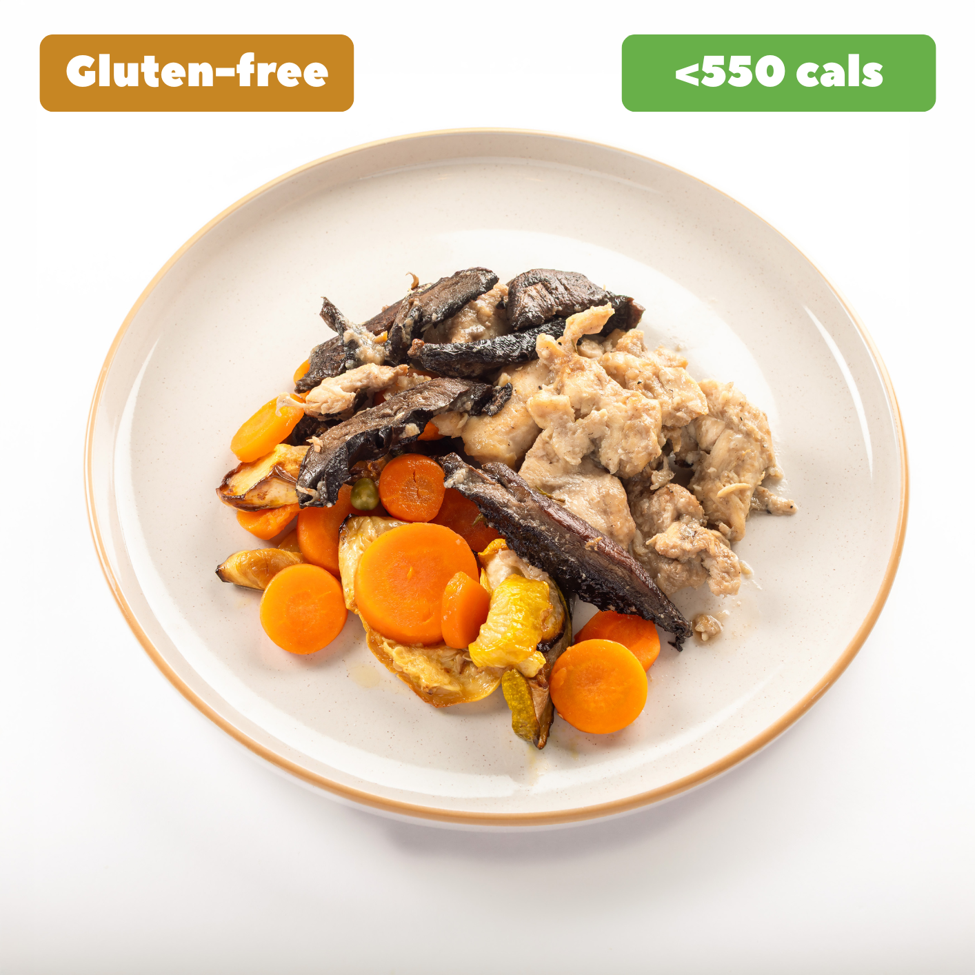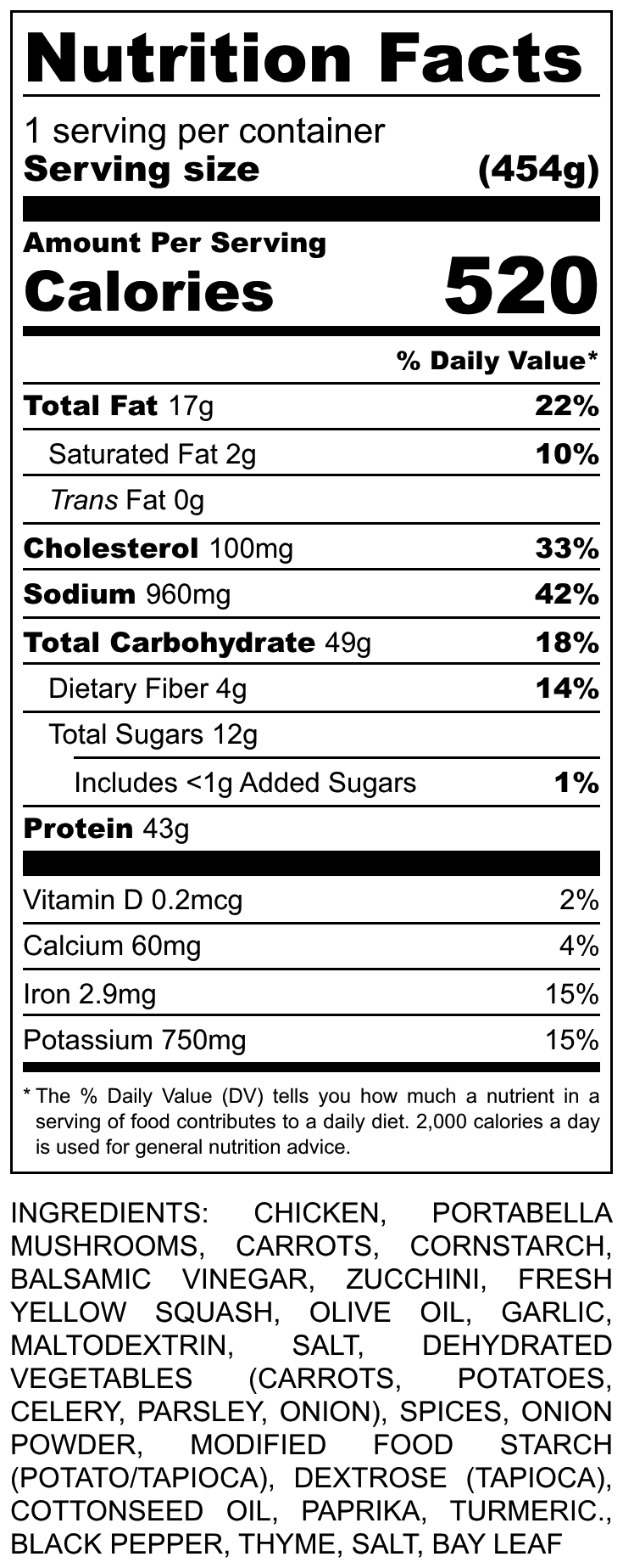 Savor our Balsamic Mushroom Chicken, tender bites of chicken and roasted portabella in a rich, tangy balsamic glaze, paired with a colorful medley of carrots and squash for a hearty, well‑balanced plate.