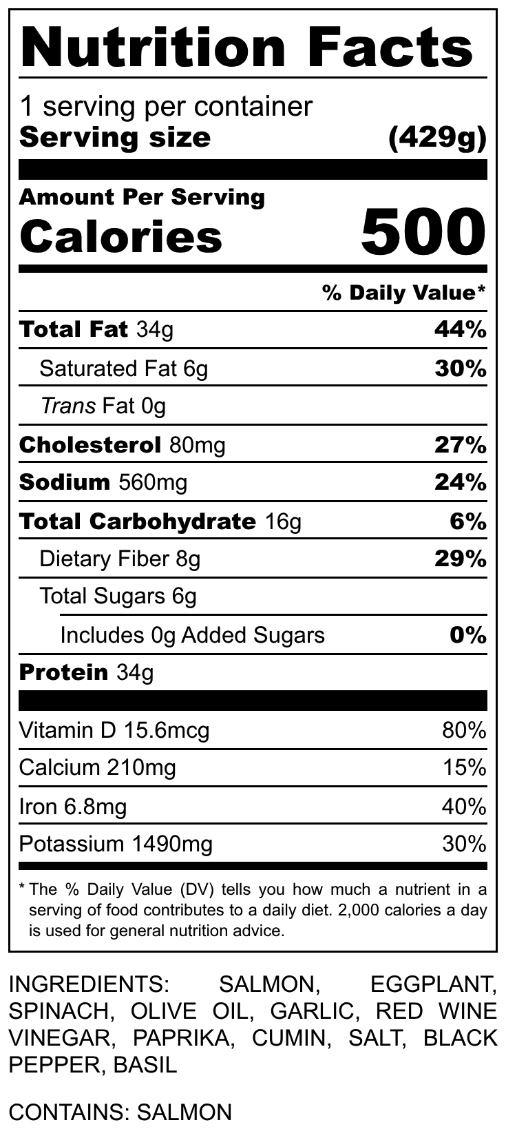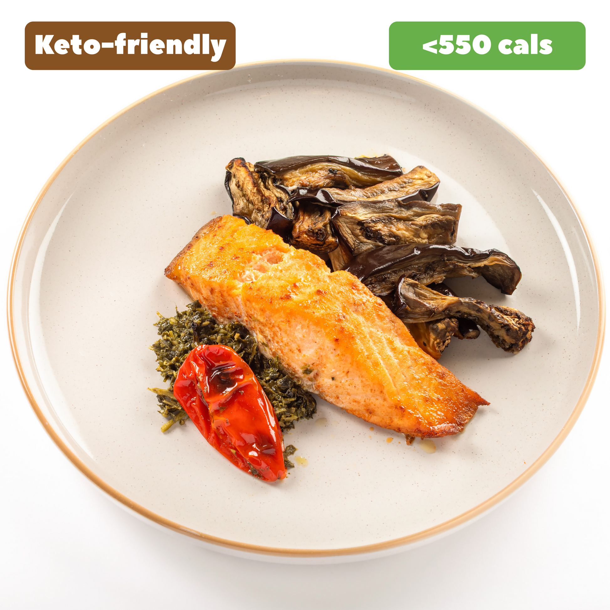 Enjoy our Paprika‑Roasted Salmon—succulent fillet seasoned with smoky paprika—paired with tender roasted strips of eggplant and a sweet roasted pepper accent for a simple, elegant, ready‑to‑heat meal bursting with clean Mediterranean flavor.