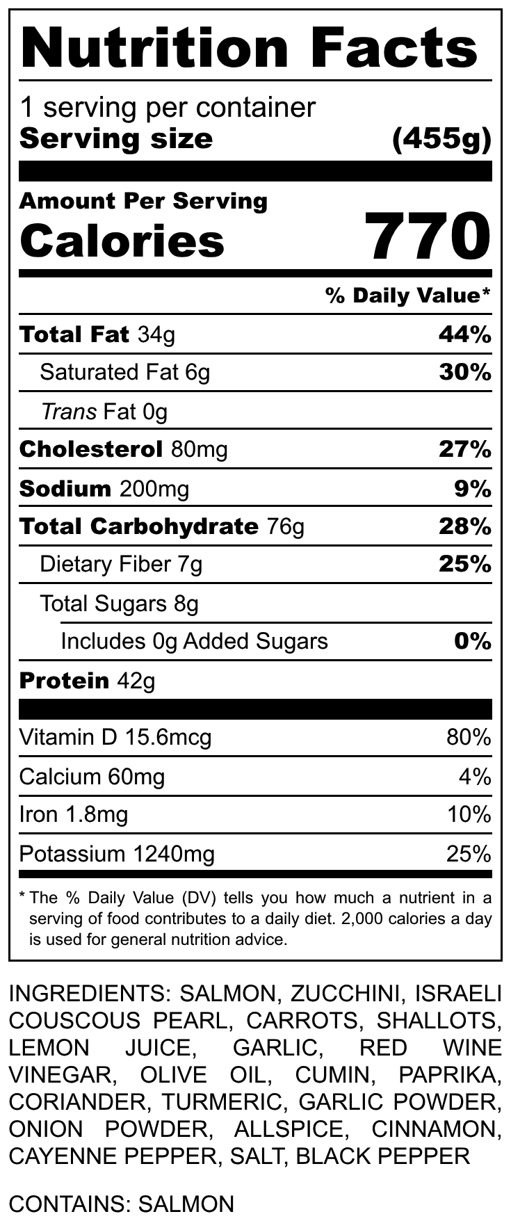 Enjoy our spiced Shawarma Salmon paired with fluffy couscous and a colorful mix of veggies for a bold, Mediterranean-inspired meal.